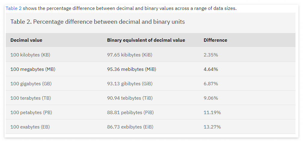 SI/ IEC 단위에 따른 오차 가이드 라인은 아래 IBM 문서에서 확인할 수 있다.