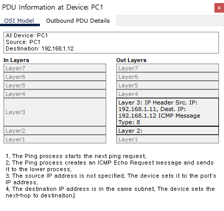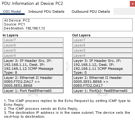 PC1 (192.168.1.11)์์ PC2 (192.168.1.12)๋ก ping ๋ณด๋๊ณ , ํ๋์ reply๋ฅผ ๋ฐ๊ธฐ๊น์ง์ ๊ณผ์ ์ ๋ค์๊ณผ ๊ฐ๋ค.