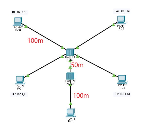 ์์ ๊ฐ์ด ํ๋ธ๋ฅผ ํตํด์ ์ฐ๊ฒฐํ๋ฉด PC0์์ ์ด 250m ๋จ์ด์ ธ ์๋ PC4๊ณผ๋ ํต์ ์ ํ ์ ์๋ค.