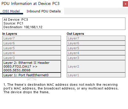 Layer 2์ ๋ํ ์ ๋ณด๊ฐ ์๋ค. - Arp๋ PC1์์ Hub์ ๋๋ฌํ๊ณ , Hub๋ ์์ ์๊ฒ ์ฐ๊ฒฐ๋ ๋ชจ๋ ํฌํธ๋ก Arp๋ฅผ ๋ณด๋ธ๋ค. (TARGET IP:192.168.1.12)