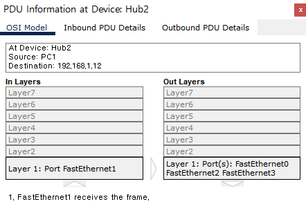OSI 7 ๋ชจ๋ธ์ Layer 1(๋ฌผ๋ฆฌ๊ณ์ธต)์ ์ฅ๋น์ธ Hub๊ฐ ์ด๋ค์์ผ๋ก ๋์ํ๋์ง ๋ณด๋๋ก ํ๋ค.