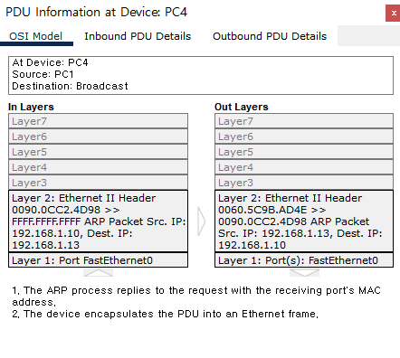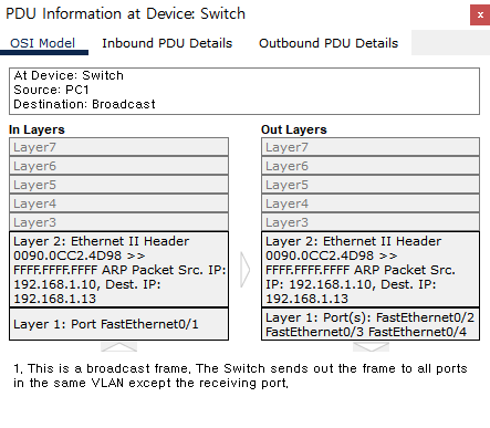 Switch#show arpโ - PC1์์ PC4๋ก ping์ ๋ณด๋ด๋ฉด, PC1์์ ๋ค์๊ณผ ๊ฐ์ outbound ํจํท์ด ๋๊ฐ๋ค.