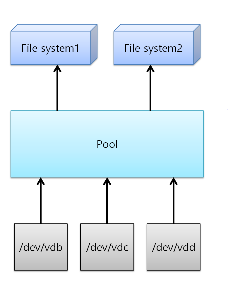 위의 사진처럼 디스크 디바이스를 pool 단위로 맵핑하고, 파일 시스템은 pool 에서 프로비저닝 된다.